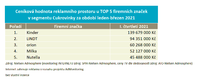 Ze značek měla v ceníkových cenách nejvyšší výdaje značka Kinder (140 mil. korun), Lindt (94 mil. korun) a Orion (60 mil. korun).