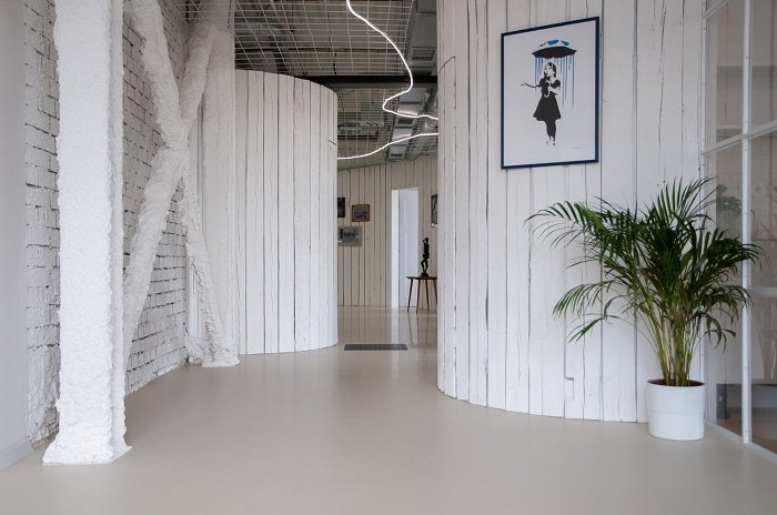 Interiéry nových kanceláří tvoří například příčky z použitých lahví od vína, stěny obložené dřevěnými deskami původem ze starých trámů, dále skříně, knihovny nebo kuchyňky vyrobené z nápojových kartonů, namísto běžných akustických panelů je na stropě použita ovčí vlna a v neposlední řadě nechybí ani plně funkční semafor pomyslně řídící pohyb v zúžené části vedoucí k sociálnímu zázemí.