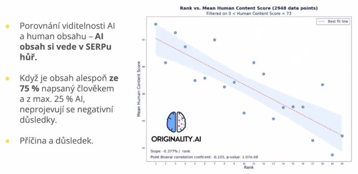 Vztah automaticky generovaných textů nástroji AI a jejich pozici ve vyhledávání popsal na setkání Josef Řezníček z marketingové agentury Včeliště. Vysvětlil, jakým způsobem vyhodnocuje Google kvalitu textů, která má vliv na pozici ve vyhledávání. Google k posuzování kvality využívá konceptu EEAT (experience, expertise, authority, truthworthiness) a pokud text splňuje tyto parametry, zapojuje ho do výsledků vyhledávání. Mezi tyto nástroje patří např. nástroj Originality AI, který má podle Josefa Řezníčka až 90% úspěšnost pro rozpoznávání textů generovaných pomocí ChatGPT 4. Dosavadní výsledky přitom ukazují, že čím víc je obsah generovaný AI, tak tím má statisticky nižší (tedy horší) pozice ve vyhledávání. Naopak původní a originální články zaujímají pozice vyšší.