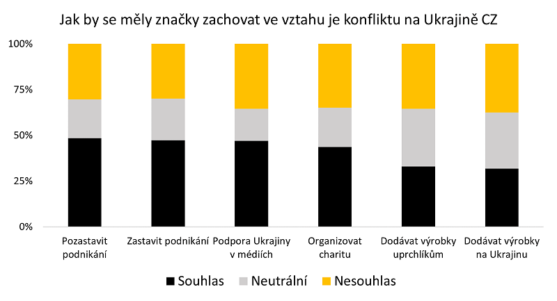Z pohledu marketingu nás pak nejvíce zajímá, jak současný stav dopadá na značky. Potvrdil se značný příklon k nákupu značek, které podporují Ukrajinu, jakožto výsledek rané fáze konfliktu, rezonance tématu a výrazné vlny emocí s tím spojených, díky čemuž u některých spotřebitelů dochází k redefinici vnímání a postojů i ke značkám samotným s ohledem na jejich přístup. Tento stav je nejvýraznější v Polsku, kde více než polovina lidí preferuje nákup aktivně zapojených značek. Ostatní země jsou v tomto chladnější, většinou je deklarovaný dopad kolem čtvrtiny až třetiny lidí. Výjimkou je Maďarsko, kde je proaktivní přístup k podpoře Ukrajiny u značek vnímán v pozitivních konotacích minimálně a naopak znamená spíše negativní dopad na nákup značky.