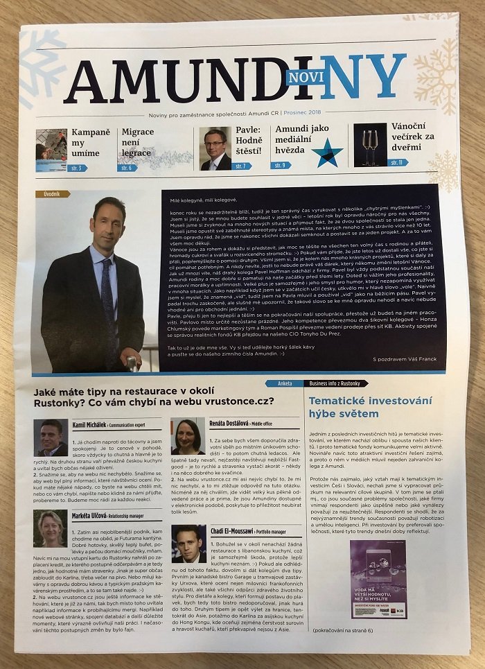 Dalším nástrojem pro naši interní komunikaci je intranet, kam dáváme novinky, na které ale také jednou za 14 dní upozorňujeme prostřednictvím newsletteru. Našim zaměstnancům tak poskytujeme informace o nových produktech, o poledních menu a tipech na kulturní a sportovní akce v okolí.