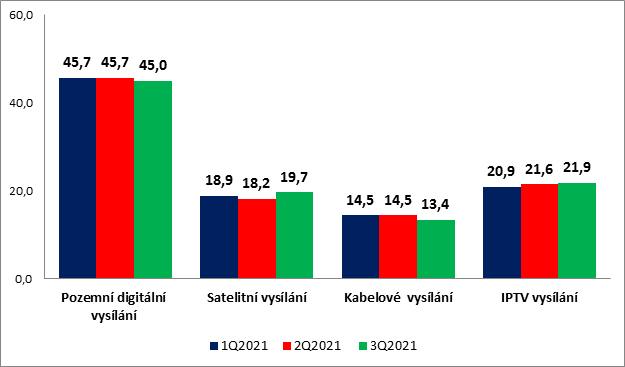Z dat Kontinuálního výzkumu (konkrétně z poslední dostupné výzkumné vlny červenec - ´září 2021) vyplývá, že většina (45%) domácností využívá pro příjem televize pozemní digitální signál DVB-T2, 19,7% sleduje vysílání přes satelit, 13,4% je kabelově vybavených a téměř 22% domácností sleduje televizi prostřednictvím internetu (IPTV). Internetové připojení má 83% českých domácností.
