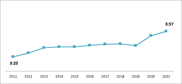 Data dále ukazují, že v prvních deseti měsících roku 2021 sledovalo televizi každodenně v obecné cílové skupině 4+ přes 6,8 milionů diváků (průměrný počet diváků, kteří denně alespoň tři minuty kontinuálně sledovali dané stanice).