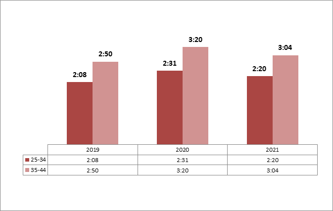 Diváci ve věkové kategorii 25-34 a 35-44 trávili lidé u televize podle říjnových dat v průměru více než 2 až 3 hodiny denně. „Na jednu stranu je možné nárůst sledovanosti v podzimní části roku spojovat s kratším dnem či chladnějším počasím, nicméně rok 2020 ve svých extrémních hodnotách souvisí jasně s pandemií (3h 20 min. u CS 35-44). Letošní rok už není tak extrémní, přesto u zmíněné cílové skupiny přesáhla sledovanost tři hodiny,“ vysvětluje dále ATO.
