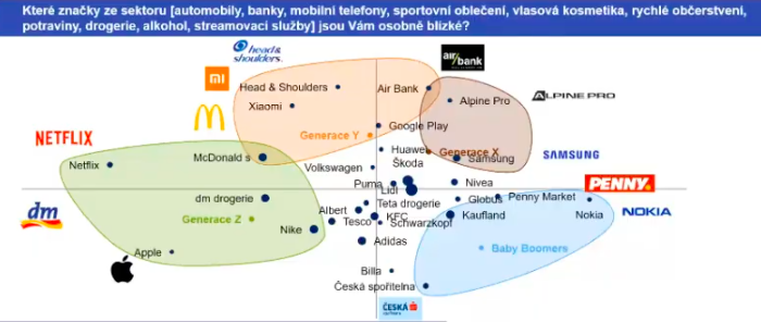 Mezi značky, které mají čeští spotřebitelé v oblibě napříč generacemi, patří Škoda, Lidl, KFC, Albert nebo Adidas. Naopak třeba Kaufland, Penny Market a Nokia jsou oblíbenější více než u jiné u Baby Boomers, narozených v letech 1946 až 1965. U mladší generace X, narozené mezi roky 1966 a 1979, boduje Head & Shoulder, Xiaomi či Air Bank, kterou mají rádi i příslušníci generace Y, dosahující věku od 26 do 40 let, kteří si cení ještě například značek Alpine Pro nebo Samsung. Generace Z, kam se řadí lidé od 6 do 25 let, má nejblíže ke značkám z oblasti zábavy a technologií, jako je Apple a Netflix, které doplňují McDonald’s či Nike.