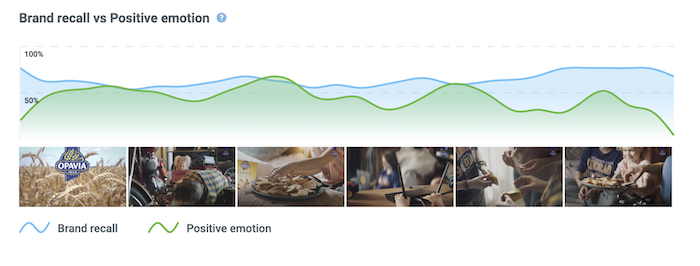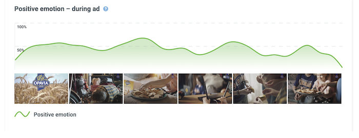 Diváci během sledování zaznamenávali vteřinu po vteřině svoje libé i nelibé pocity, z nichž se v Behavio Platform tvoří emoční křivky. Ta s pozitivní emocí má několik vrcholů, které tvůrci nejspíš velmi přesně předvídali, neboť s nimi cíleně pracují a využívají jich ke zvýšení efektivity reklamy. Tohle video není jen líbivé, silné momenty v něm slouží ke zvýšení salience brandu – jak to má být.