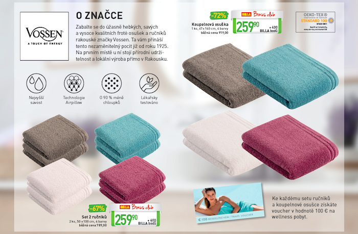 Set dvou ručníků nebo osušku členové klubu získají už za 400 bodů a doplatek 259,90 Kč. Zboží nebude možné koupit za plnou cenu bez užití bodů z karty. Voucher na wellness pobyt, který zákazníci obdrží při koupi setu ručníků nebo osušky, je platný až do 31.prosince 2023. Akce bude probíhat na všech prodejnách Billa od 26. května do 20. července 2021.