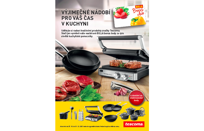 Obchodní řetězec Billa přichází s novou věrnostní kampaní, ve které mohou členové věrnostního programu získat výrobky Tescoma za příznivější cenu. Produkty si mohou směnit za klubové body a doplatek v období od 27. 10. do 31. 12. 2021 nabízí řetězec členům Billa Bonus clubu sérii nádobí a potřeb pro domácnost.