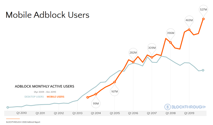 Blokování reklamy na internetu rok od roku roste. Zatímco dříve to bylo doménou především desktopů, nyní je adblocking stěžejní na mobilních telefonech. Podle nejnovější studie společností BlockThrough a PageFair dosáhl počet lidí používajících adblocking na svých mobilech 527 milionů, což je o 64 % více než před třemi lety. Lidí, kteří si reklamu blokují na počítači, je 236 milionů, což je naopak o 16 % méně než před třemi lety.