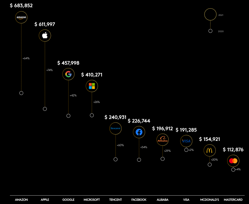 Internetový obchod Amazon, který v roce 1994 založil Jeff Bezos, má nyní značku oceněnou podle odhadů na 684 miliard USD (14,7 bilionu Kč). Hodnota Applu, založeného v roce 1976, podle Kantaru činí 612 miliard USD. Meziročně obě značky posílily, a to na úrovni 60-70 %.
