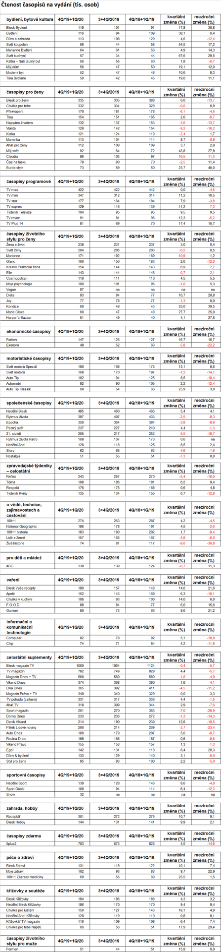 Souhrnně tvořili čtenáři tisku ve sledovaném období od 4. čtvrtletí 2019 do 1. čtvrtletí 2020 téměř 7,5 milionu obyvatel České republiky ve věku 12 až 79 let. Představují tak 84 % z této skupiny zahrnující téměř celou populaci. Jak už jsme informovali, stabilní byla čtenost deníků jako celku, kde se zvýšil nebo zůstal zachován celkový počet čtenářů u poloviny titulů.