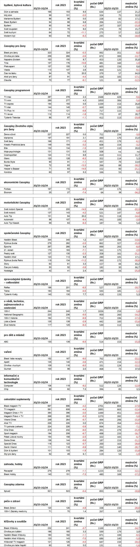 K nejčtenějším časopisům nadále paří magazíny společenské, programové a pro ženy. Nejvyšší nárůsty si připsaly časopisy Čas na lásku a Auto Tip ve srovnání s daty za rok 2023 a pokud by se zohlednilo i meziroční srovnání, tak se k nim řadí i Čas pro hvězdy.