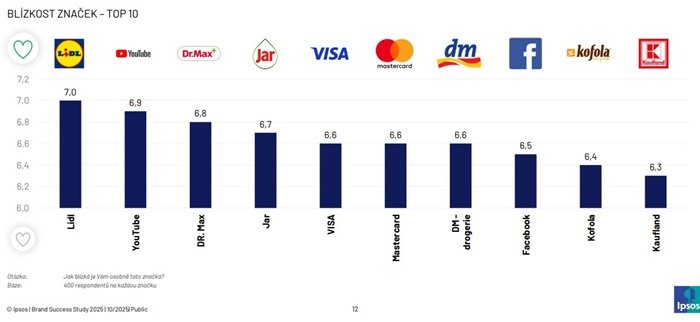 Čeští spotřebitelé označují za nejbližší značku Lidl, následovanou YouTubem a lékárenskou sítí Dr. Max, která je zároveň nejvýše umístěnou ryze českou značkou. Vyplývá to z aktualizovaného průzkumu agentury Ipsos.