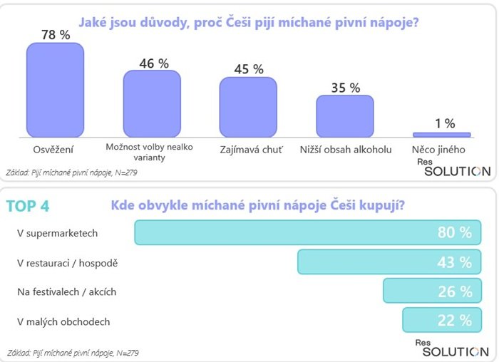 Míchané pivní nápoje Češi nejčastěji nakupují v supermarketech (80 %), méně pak v restauracích (43 %) a na festivalech (26 %). V malých obchodech je pořizuje 22 % respondentů. Přes domácí přípravu vede pohodlí nákupu: pouze 3 % si je připravují doma často a 11 % občas. Většina (67 %) to nikdy nedělá.