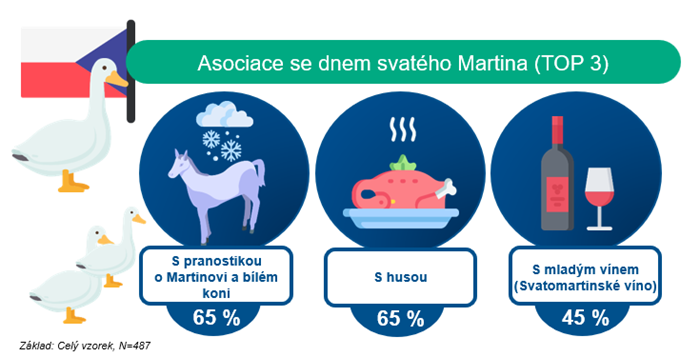 Největší podíl české onlinové populace starší 18 let (65 %) má svátek svatého Martina spojený s husou nebo s pranostikou o svatém Martinovi přijíždějícím na bílém koni. S mladým, tzv. svatomartinským vínem si 11. listopad spojuje 45 % respondentů. Více něž pětina respondentů uvádí v asociaci se svátkem konání slavností svatého Martina. Jedna desetina dotázaných si svátek spojuje s tradičním pečivem, 2 % dotázaných s koledou. Ukazuje to výzkum zaměřený na svatomartinský svátek a tradici Beaujolais, který pro MediaGuru.cz připravily agentury Ressolution Group a Nielsen.