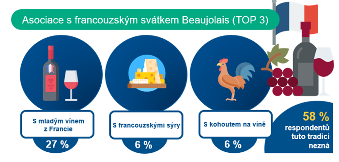 Tradici francouzského svátku Beaujolais nezná téměř 60 % českých respondentů, proto si ani tento svátek s ničím nespojují. Více než jedné čtvrtině respondentů (27 %) se v souvislosti se svátkem Beaujolais vybaví mladé francouzské víno. 6 % dotázaných si Beaujolais spojuje s francouzskými sýry, stejný podíl respondentů si v asociaci se svátkem vzpomene na kohouta na víně.