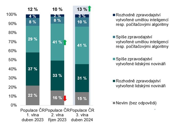 Ve třetí vlně zároveň přibylo Čechů, kteří by si vybrali zpravodajství vytvořené umělou inteligencí. Většina ale (bezmála tři čtvrtiny Čechů) stále preferuje práci lidských novinářů na úkor umělé inteligence. Jejich podíl ale v čase mírně klesá. I v aktuální vlně převažuje preference přečtení zpravodajství člověkem-moderátorem.