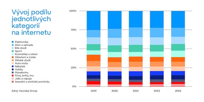 Už v předchozích letech do e-commerce prostředí pronikali obchodníci se zbožím, které dříve bylo dostupné pouze v kamenných prodejnách. „Lidé chtějí využívat výhod online nakupování bez ohledu na druh zboží. Chtějí mít možnost porovnat si ceny, přečíst si recenze a vybrat si takového prodejce, který jim vyhovuje a nabízí za vydané peníze nejlepší službu. Na internetu si pořizují i věci s nižší pořizovací cenou, což může obchodům získat pravidelně se vracející zákazníky,” přidává svůj názor Jan Mayer, výkonný ředitel Heureka CZ/SK. Největší přesun do online prostředí byl pochopitelně v době pandemie, a nově vzniklým segmentům se poměrně daří držet si svůj podíl. Stále je nejsilnější elektronika, která však v řádu let postupně ustupuje – od roku 2019, kdy měla 25 %, je aktuálně na 22 %. Naopak postupně roste sekce kosmetiky a zdraví z 6 % v roce 2019 na aktuálních 8 %.