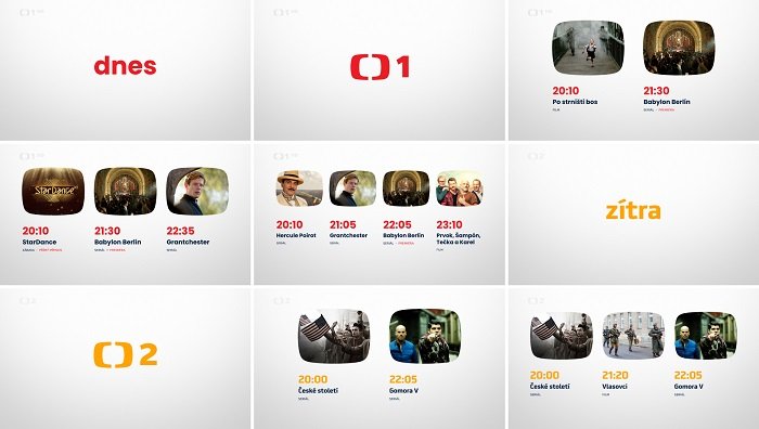 Součástí úprav vizuální identity České televize je nový a strukturovanější vzhled upoutávek a přehledu programů ČT1 a ČT2. Česká televize také nově promlouvá ženským hlasem.