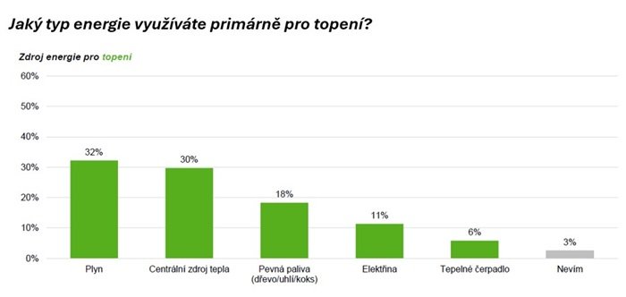 Jako hlavní zdroj vytápění využívají domácnosti nejčastěji kotle na zemní plyn (32 %) a dálkové teplo (30 %), méně už pak kotle na pevná paliva (18 %). Mezi zdroji energie pro vaření dominuje elektřina (57 %) před zemním plynem (36 %). V oblasti teplé užitkové vody je nadvláda elektřiny méně dominantní (40 %), a to hlavně kvůli značnému podílu centrálního ohřevu (32 %). Pouze 9 % domácností přitom plánuje změnu typu energie pro topení, vaření nebo ohřev vody. Mezi preferovanými novými zdroji figurují v přibližně rovnocenném zastoupení fotovoltaika, plyn, elektřina, ekologický kotel na pevná paliva a tepelná čerpadla.
