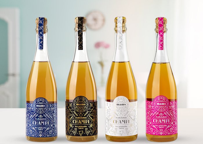 V současnosti Champi nabízí lahve se čtyřmi různými etiketami: zatímco černá a bílá cílí spíše na dospělé, růžová a modrá si hrají s dětskými obrázky. „Původně jsme vytvořily černou etiketu s modrou, které vypadají naprosto skvěle, ale cítily jsme, že k nim chybí barvy ,do páru'. Nakonec jsme ještě navrhly růžovou a bílou etiketu. Líbí se nám, že si můžete zvolit barvu etikety podle toho, jaká událost vás čeká,“ vysvětlují zakladatelky.