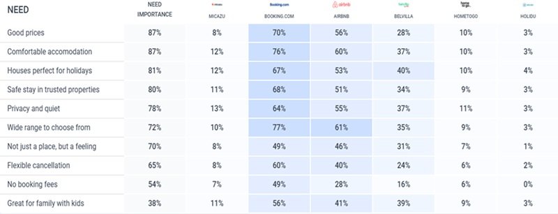 Evropská Belvilla se proto rozhodla komunikovat, že je „skvělá pro rodinu s dětmi“. Potřeba je sice důležitá „jen“ pro 38 % respondentů, ale většina velkých hráčů v ní není silná. Belvilla se proto tuto potřebu rozhodla obsadit a intenzivněji komunikovat. Z dat je pak vidět, že si lidé tuto asociaci ke značce vybavují relativně častěji (o 8 procentních bodů více).