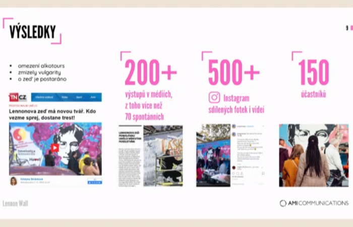 Jan Kučmáš, partner v agentuře Ami Communications, popisoval akci na záchranu Lennonovy zdi na Velkopřevorském náměstí v Praze na Kampě. Na agenturu se obrátil v roce 2019 Řád Maltézských rytířů s prosbou o pomoc. „Přáli si zachovat zeď jako turistickou atrakci, ale vyhnout se overturismu,“ uvedl Jan Kučmáš.