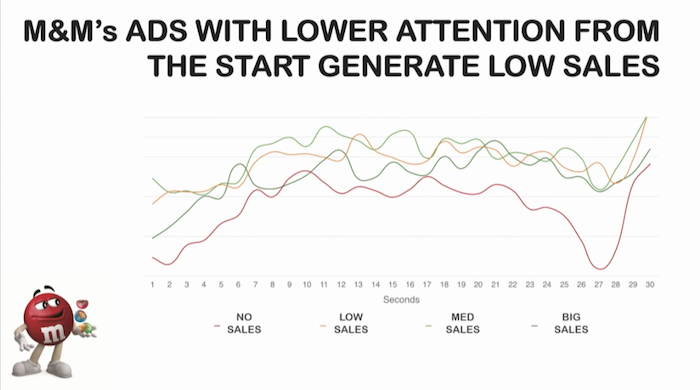 - Pozornost. Je třeba ji získat hned na začátku spotu. Pokud se to nepodaří, pravděpodobnost, že taková reklama nebude mít dobré dopady na prodeje, se zvyšuje. Dokládají to i zkušenosti Mars z kampaní značky M&M’s (viz graf níže)