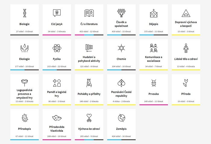 Videa pokrývají přes dvacítku předmětů od biologie po zeměpis, jsou členěna podle stupňů vzdělávání i konkrétních témat. Témat jsou zatím dvě stovky. Plánem je ale portál do budoucna rozšiřovat nejen o nová videa, nové předměty, ale i o pracovní listy.