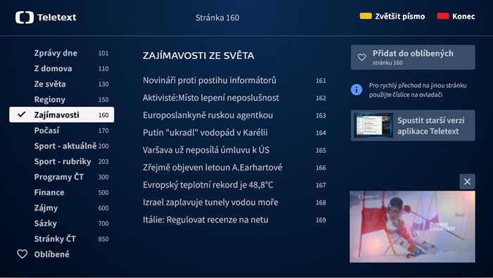 Česká televize spustila novou verzi hybridní aplikace Teletext postavené na internetové technologii. V novém designu rozšiřuje obsah Teletextu o nové funkce, běžně využívané na internetu. Novinkou je například zvětšení písma pomocí žlutého tlačítka nebo možnost ukládat stránky do oblíbených a vytvořit si vlastní blok těch nejžádanějších.