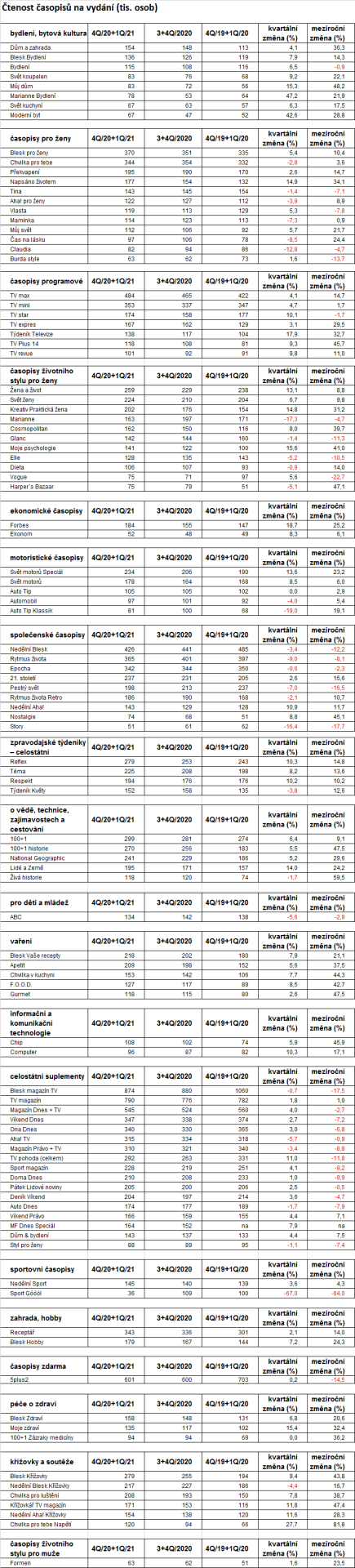 Mezi časopisy pro ženy se na pozici nejčtenějšího vrátil Blesk pro ženy. Z časopisů životního stylu pro ženy je nejčtenější Žena a život, také v kategorii motoristických časopisů se na vedoucích pozicích udržují Svět motorů Speciál a týdeník Svět motorů. Nová data výzkumu čtenosti přinášejí příznivá čísla i pro časopisy o bydlení na čele s magazínem Dům a zahrada a také časopisům o vědě, cestování a zajímavostech, kde si pozici nejčtenějšího udržuje 100+1.