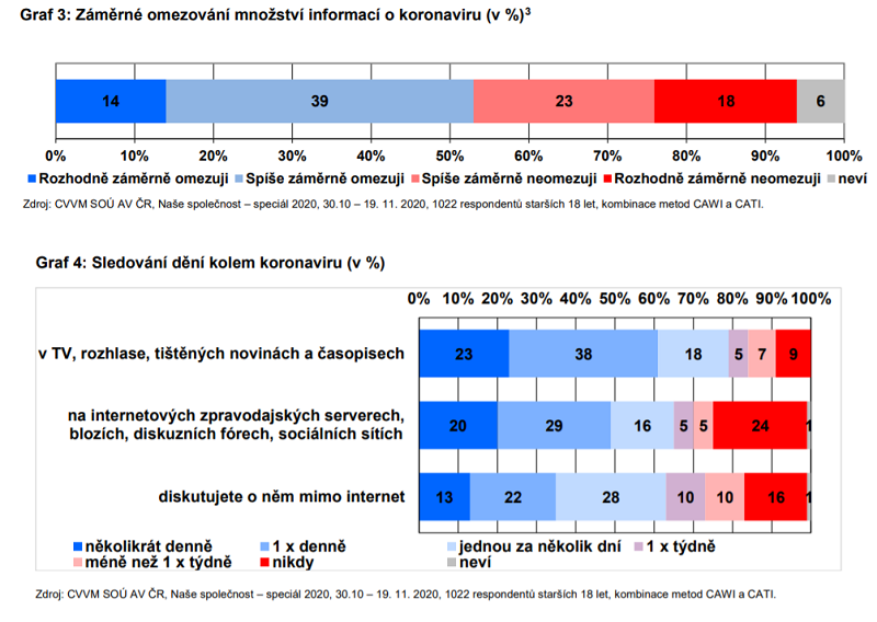 Více než polovina (53 %) občanů záměrně omezuje množství informací, které se k nim o koronaviru dostávají. I přes toto záměrné omezování je zájem o sledování informací značný. Denní sledování dění kolem koronaviru v televizním a rozhlasovém vysílání, tištěných novinách či časopisech uvádí třípětinová většina (61 %) populace. Na internetových zpravodajských serverech, blozích, diskuzních fórech a sociálních sítích pak dění denně sleduje téměř polovina (49 %) veřejnosti. Vyplývá to z výzkumné zprávy Centra pro výzkum veřejného mínění (CVVM).