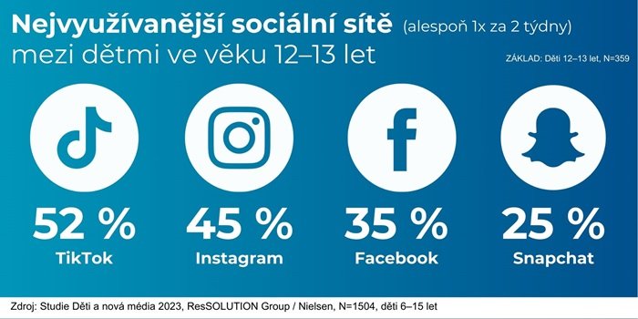 Nejvyužívanější sociální sítí mezi dětmi ve věku 12–13 let je TikTok – aspoň jednou za dva týdny ho sleduje 52 % dětí, přičemž výrazněji vede u dívek. Druhé místo patří Instagramu (45 %), třetí Facebooku (35 %) a čtvrté Snapchatu (25 %). Pro srovnání: ve věku 45–54 let je nejvyužívanější sociální sítí podle dat společnosti NADA Research Facebook (81 %), následují Instagram (40 %), Pinterest (18 %) a Twitter (16 %).
