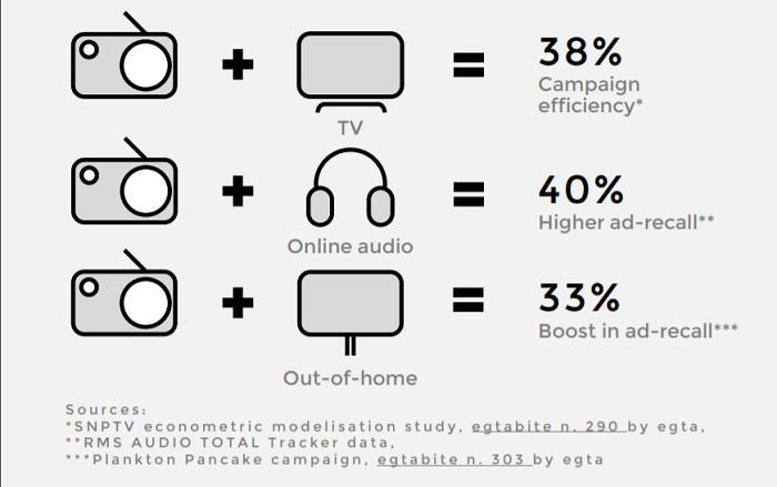 Rozšiřování příjmu rádia o další technologické platformy a multiplatformita rádia zvyšuje možnosti jeho dosahu. Dostupné výzkumy také ukazují, že audio vysílání většinou posluchači přijímají v momentě, kdy nesledují žádnou obrazovku. Podle zprávy Nielsen Audio Report se 79 % příjmu audio obsahu odehrává v momentě, kdy posluchači nemohou sledovat vizuální média. Podle dat EGTA přináší rádiová reklama v kombinaci s reklamou v audio médiích dostupných online (např. podcast) vyšší schopnost vybavení si reklamy. K pozitivům rádiové reklamy má také patřit vysoká míra aktivace, návratnost investic a možnosti dobrého cílení.