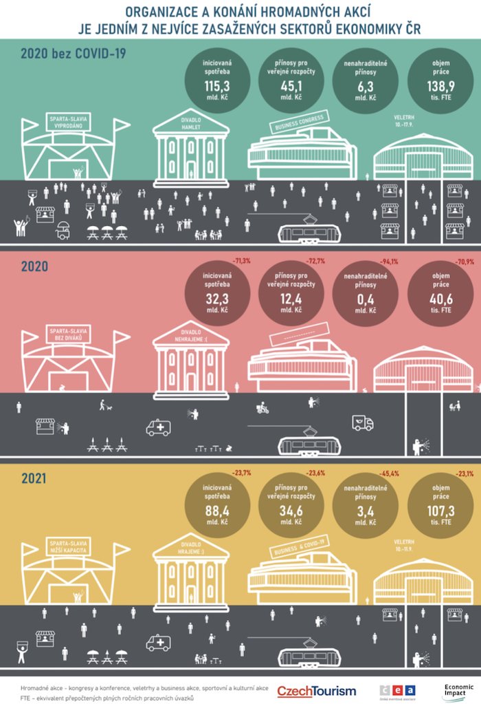 Kongresový, eventový a veletržní průmysl zažívá letos velmi těžké období. Pandemie koronaviru hromadné akce doslova paralyzovala a ani nyní se situace nelepší. Vzhledem k převládající nejistotě nemohou pořadatelé plánovat akce ani na příští rok. Podle nejnovější studie Economic Impact pro agenturu CzechTourism a Českou eventovou asociaci lze letos očekávat propad celkové spotřeby spojené s konáním akcí, tedy i za pronájem místa konání, organizace, catering, ale i ubytování, dopravu a další služby, o více než 71 %. Ohroženo je do budoucna v odvětví také 90 až 110 tisíc pracovních míst.