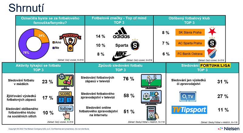 Za fotbalové fanoušky se považuje necelá čtvrtina (24 %) tuzemské internetové populace starší 15 let, tj. necelé 2 mil. lidí. K jejich nejoblíbenějším klubům nejčastěji patří Slavia, Sparta, Baník Ostrava a Viktoria Plzeň. Nejčastějším způsobem sledování fotbalu jsou přímé televizní přenosy a poté sledování televizního zpravodajství. Vyplývá to z průzkumu Nielsen Admosphere, který pro MediaGuru.cz připravila.
