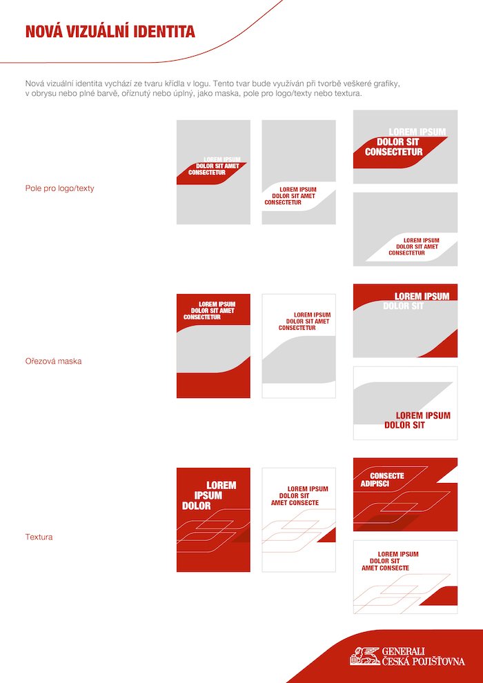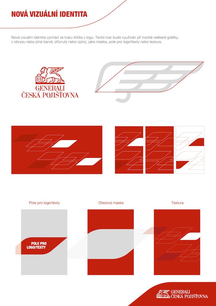 Hlavní motiv nového vizuálního stylu vychází z aktuálního loga pojišťovny – konkrétně je odkazem na křídlo lva. „Tento tvar budeme využívat při tvorbě veškeré grafiky v obrysu nebo v plné barvě. Oříznutý nebo úplný, objevit se může také jako ořezová maska, pole pro logo či texty nebo s ním budeme pracovat čistě jako s texturou,“ přibližuje detaily Zdeněk Mrkva, senior manažer marketingové komunikace Generali České pojišťovny.
