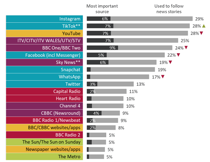 Nová zpráva britského regulátora Ofcom ukazuje, že u věkové skupiny 12–15 let klesá oblíbenost tradičních zpravodajských kanálů jako zdrojů zpráv. Naopak sociální sítě jsou navzdory nízké důvěře stále na vzestupu. Jako primární zdroj zpráv je vyhledává čím dál více teenagerů a poprvé dokonce zaujaly Instagram (29 %), TikTok (28 %) a YouTube (28 %) první tři příčky na čele žebříčku hlavních zpravodajských kanálů u dětí ve věku 12-15 let ve Spojeném království. Za poslední rok narostl zejména TikTok.
