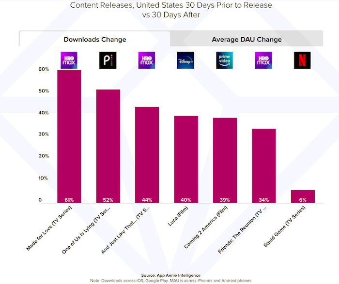 Celkem devětkrát se za poslední čtyři roky zvýšila doba strávená konzumací live streamingu. Sledováním videoobsahu (i na vyžádání) vzrostla na mobilních telefonech za pandemických let oproti roku 2019 o 16 %. Zájem lidí o aplikace typu Netflix, HBO Max, Peacock, Disney+ či Amazon Prime byl podpořen mimo jiné i představením exkluzivního obsahu – například Hra na oliheň na Netflixu zvýšila počet stáhnutí příslušné aplikace o 6 %, seriál Made for Love přinesla HBO Max v mobilním prostředí 61% růst.