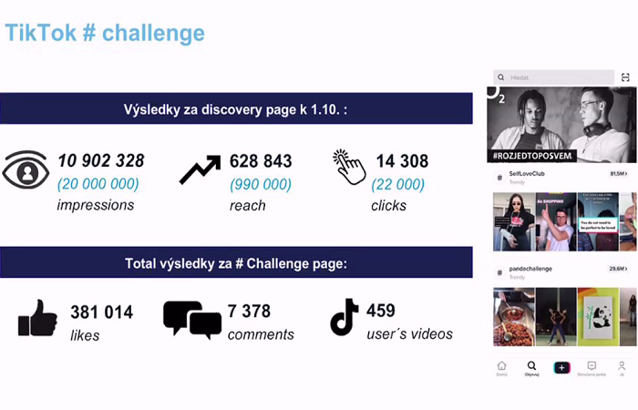 O2 přidalo i taneční challenge, díky které mělo velký zásah. Výhodou TikToku je podle Tomáš Hansla oproti Facebooku delší průměrná délka zhlédnutí, která je 10 vteřin, což je o 7 více než na Facebooku. Ve srovnání s jinými platformami je pak na TikToku nízká cena za nákup impresí, třeba Snapchat byl asi 2krát dražší. Navíc podle průzkumů je paradoxně 76 % sledujících starších 18 let a platforma má nadprůměrný engagement rate. V loňském srpnu bylo v Česku na TikToku jeden milion uživatelů. O2 se nakonec podařilo k 1. říjnu získat přes 10 mil. impresí, výzvy se zúčastnilo přes 450 lidí.