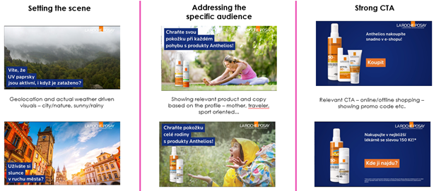 Vytvořili jsme tak relevantní komunikaci, která se přizpůsobuje specifickým okamžikům a prostředím, ve kterých se naši uživatelé nacházeli. Využití kontextu přináší výhody i v situacích, kdy tradiční metody cílení ztrácejí na účinnosti. U kampaně pro značku Anthelios jsme se zaměřili na osvětu a inspiraci, abychom uživatele přesvědčili o důležitosti opalování, ať už je jakékoli počasí. Jiným příkladem jsou například různé kreativy ráno a večer.