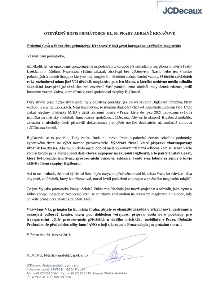 Společnost JCDecaux, která nyní v Praze vlastní a provozuje většinu přístřešků pro MHD, píše otevřený dopis primátorce Adrianě Krnáčové. Vyzývá ji v něm, aby se zasadila „o zřízení nové, nestranné a nezaujaté odborné komise, která pod dohledem veřejnosti připraví zcela nové podklady pro transparentní výběr provozovatele přístřešků a dalšího městského mobiliáře v Praze“. Na otevřený dopis zareagovala konkurenční firma BigBoard, a to jednak vlastní prohlášením, jednak podáním trestního oznámení na ředitele JCDecaux Pavla Slabého.