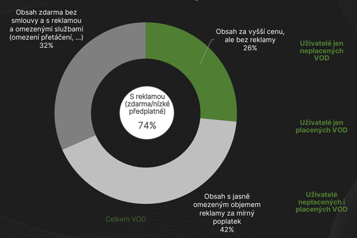 Asi pětina uživatelů VOD služeb je ochotná platit vyšší cenu, díky které mohou sledovat obsah bez reklam. Z jednotlivých obchodních modelů má ale nejvyšší preference ten, jehož předplatné je nižší a jehož součástí je i omezené množství reklamy (42 %). „Ve všech studiích, které jsem měl možnost realizovat nebo prostudovat, je postoj k akceptaci reklamy vždy velmi diskutabilní, většinou ve velmi negativní konotaci. Pokud ale zákazníkům nabídnete výběr mezi cenou za službu a reklamním obsahem, preference se významně změní,“ uvedl pro MediaGuru.cz Zdeněk Kubena, Research Director Knowlimits.