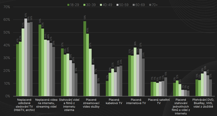 Studie Know.vod ukázala, že VOD služby využívá v Česku více než polovina populace starší 18 let (53 %). To je absolutně 4,5 mil. osob. Z nich si většina za nějakou VOD službu platí, konkrétně je to 72 % uživatelů (tj. cca 3,2 mil. osob). Placené streamovací služby si nejvíce předplácejí mladí uživatelé ve věku 18-39 let, kteří ale zároveň také nejčastěji sledují neplacená videa na internetu. Neplacené odložené TV sledování (z archivu TV stanic, HbbTV) je naopak silné u střední a starší generace (50+). Placený TV příjem (satelitní, kabelový, internetový) je pak rovnoměrně rozložen mezi generace.