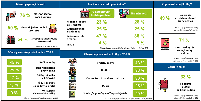 Papírové knihy nakupují tři čtvrtiny dotázané tuzemské online populace. Více než polovina pořizuje alespoň jednou ročně knihy pro někoho jiného než sebe, 50 % jich kupuje knihy pro sebe. Vyplývá to z výzkumu Ressolution Group pro MediaGuru.cz.