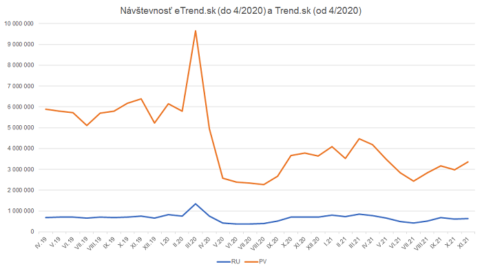 Tradičný ekonomický titul Trend prešiel na webe zmenami. Prestal používať značku eTrend.sk a zmenil doménu na Trend.sk, zároveň v apríli 2020 redizajnoval web vrátane sekcií ako Mediálne.sk. Rok predtým (apríl 2019-marec 2020) mal návštevnosť 768 tisíc RU mesačne vrátane silného “pandemického” marca s 1,35-miliónovou návštevnosťou. Rok potom (apríl 2020-marec 2021) bol na 612 tisícoch RU a v najslabších letných končil pod 400 tisícmi. Mesačné pageviews sa mu znížilo zo 6,1 milióna na 3,4 milióna.