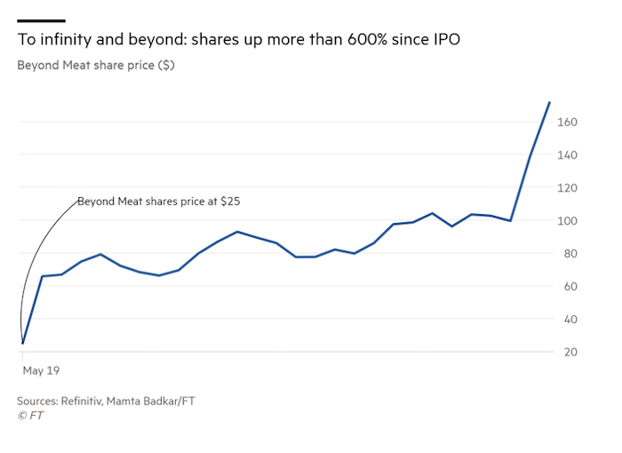 Vše vypadalo jako perfektní formulka pro úspěch a když v roce 2019 jako první společnost svého druhu vstoupila na burzu, setkala se s fenomenální odezvou. Během velmi krátké doby vystřelila cena akcií z původních 25 dolarů na více než šestinásobek. Financial Times psal o tom, že Beyond Meat míří „do nekonečna a ještě dál“.