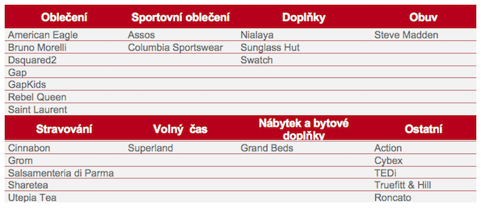 Naopak kamenný retailový trh loni opustilo 14 značek. Většinou šlo opět o módní odvětví, např. prodejce oblečení Camaïeu, Next či Promod nebo doplňků Frey Wille či Tous, skončily u nás také tři kavárenské řetězce.