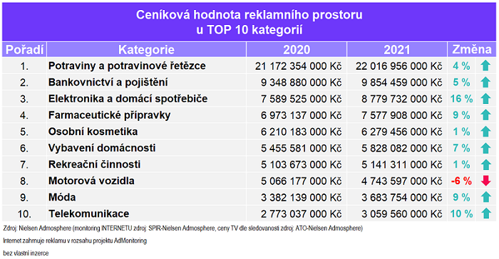 Největšími zadavateli reklamy byly v roce 2021 tři zahraniční potravinové řetězce. Potraviny se tak v Česku zároveň staly nejsilnějším reklamním segmentem. Za nimi z pohledu objemu umístěné inzerce následují segmenty bankovnictví/pojištění a elektroniky. Ukazují to data monitoringu reklamy Nielsen Admosphere Ad Intel.