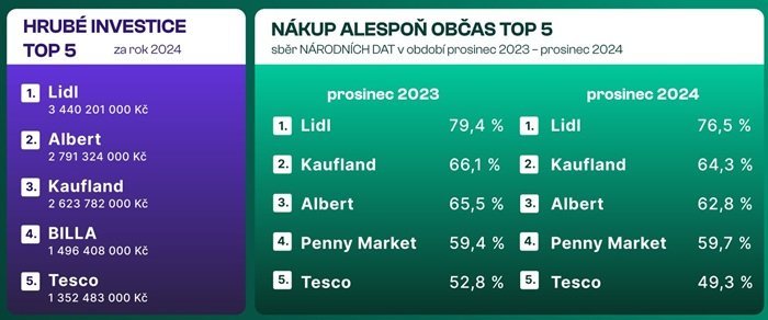 První trojice (Lidl, Albert a Kaufland) si zároveň udržuje silnou pozici také v rámci údajů o alespoň občasném nákupu. „Nejdominantnější značkou mezi potravinovými řetězci je Lidl. V jeho obchodech nakupují alespoň občas přibližně čtyři z pěti Čechů,“ komentuje výsledky Martin Chalupník z NADA Research.